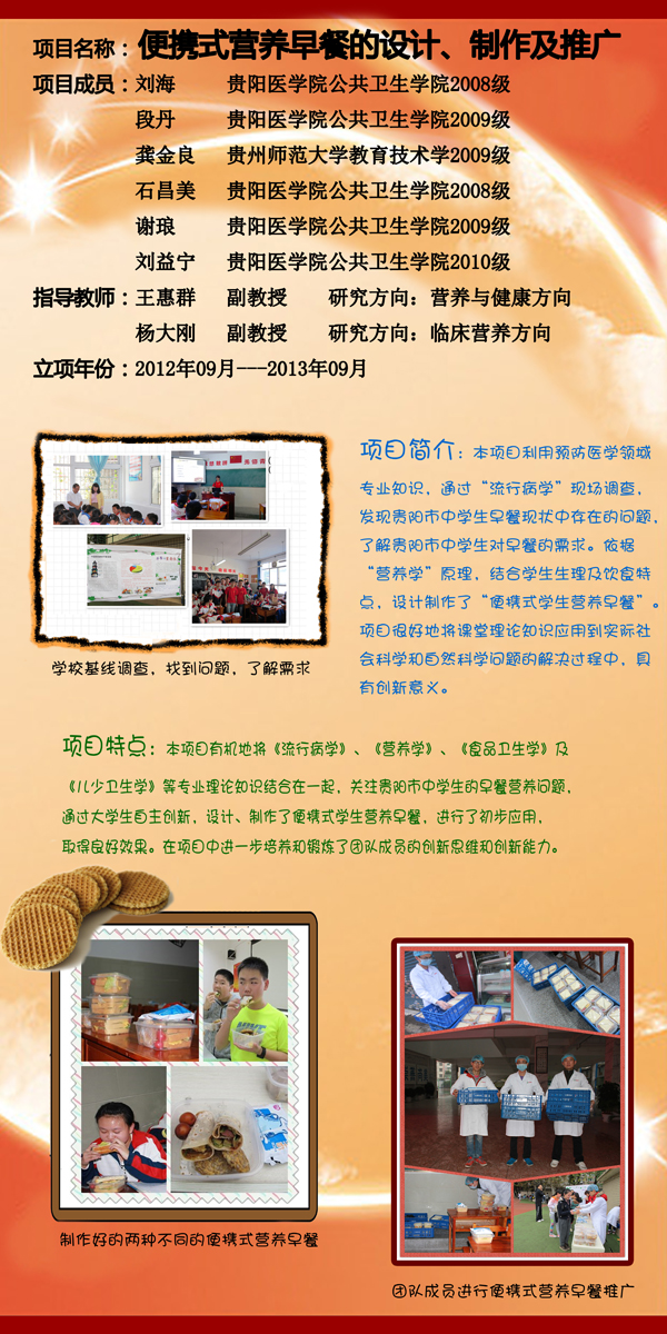 公司自启动老员工创新创业训练计划以来,领导高度重视,各教研室老师积极支持,同学们踊跃参与。在王惠群老师的指导下,刘海等6名同学通过对贵阳市某中学的中员工食用早餐的情况进行调查,并找出存在的问题,针对存在的问题进行分析,结合中员工的生理特点、饮食习惯及该年龄阶段对营养素的需求,设计出了几种便携式早餐配方,并抽取了一个班进行试吃,之后再根据反馈情况进行了调整修改,最后到贵阳市十七中进行推广。通过营养宣教,员工对早餐的重要性,早餐的量,以及早餐的营养搭配方式有所改善;经调查,在参加试行推广的员工中,愿意购买所提供的便携式营养早餐的人数占71.4%,大部分员工愿意接受本次营养早餐的营养理念及质量。