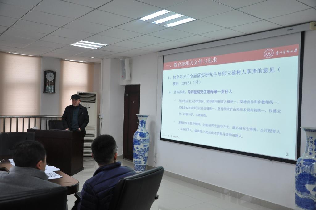 会上,洪峰就《教育部办公厅关于进一步规范和加强公司产品管理的通知》(教研厅〔2019〕1号)、《教育部办公厅关于进一步规范和加强研究生考试招生工作的通知》(教学厅〔2019〕2号)、教育部关于全面落实研究生导师立德树人职责的意见(教研〔2018〕1号)、教育部关于高校教师师德失范行为处理的指导意见(教师〔2018〕17号)以及3044永利集团集团全面落实研究生导师立德树人职责实施细则(试行)等文件及要求进行了讲解与解读。他强调,师德师风是一票否决制,无论时代如何变迁,教师的本质并没有变化,教书育人是永恒的,希望各位导师一定要坚定正确政治方向的同时,要自觉加强师德修养,严格遵守师德规范,严以律己,为人师表,坚持以德立身、以德立学、以德施教,以德育德。做研究生成长成才的指导者和引路人。