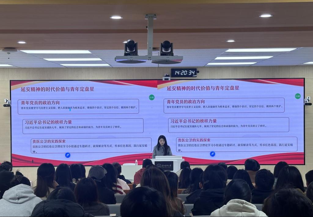 杨婉佳同志围绕聚焦“延安精神的时代传承与青年践行”进行了宣讲。她谈到,广大青年在践行延安精神的过程中需主动接过“接力棒”。在思想上,要坚守正确的政治方向,加强理论学习以提升政治素养;在学习上,要以“实事求是”的态度钻研专业知识、练就过硬本领;在实践上,需凭“艰苦奋斗”的作风扎根基层公共卫生实践、服务群众。她号召全体青年党员牢记习近平总书记的嘱托,继承和发扬党的优良革命传统和作风,让延安精神在新时代绽放新光芒,以更加昂扬的姿态踏上新征程、向着新目标前进。