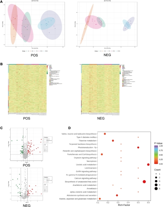POS表示质谱中带有正离子的代谢物,NEG表示质谱中带负离子的代谢物。(A)所有肝脏样品的代谢物主成分分析(PCA)结果。(B)不同代谢物的聚类图。红色和绿色分别代表显著的向上和向下调。(C)HFDS与HFD组的火山图。红点和绿点分别代表显著上调和下调的差异代谢物。(D)不同代谢物的前20个KEGG富集途径的气泡图。RichFactor定义为注释到通路的差异代谢物数量除以注释到通路中的所有已识别代谢物。
