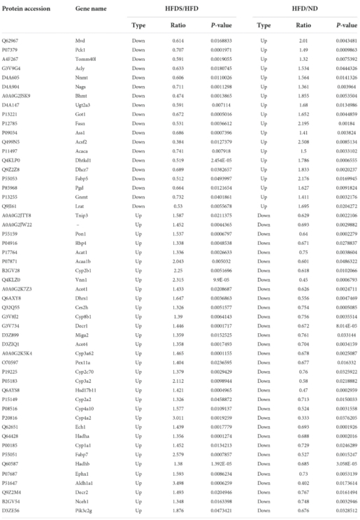 HFDS组较HFD组上调,而HFD组较ND组下调共33个蛋白。HFDS组较HFD组下调,而HFD组较ND组有19个蛋白表达上调(表1)。