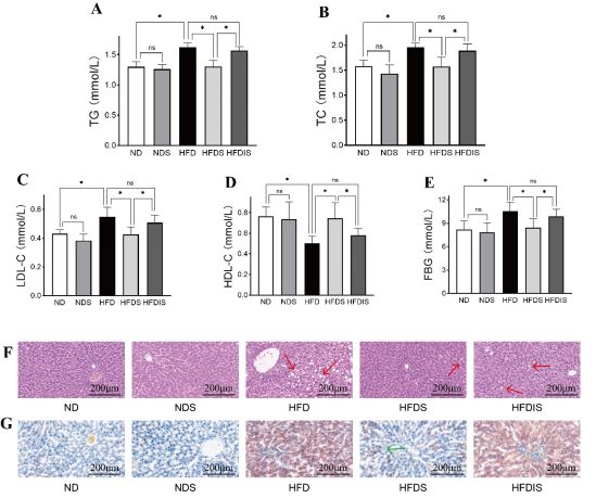 图2A–E显示了各组中TG、TC、LDL-C、HDLC和空腹血糖(FBG)的结果,如图所示,HFD组的血清TG、TB、LDL-C和FBG高于ND组(P<0.05),HDL-C浓度降低(P<0.05)。HFDS组的血清TG、TC、LDL-C和FBG低于HFD组(P<0.05),但HDL-C升高(P<0.05)。ND组和NDS组之间以及HFDIS组和HFD组之间的TG、TC、LDL-C、HDL-C和FBG结果无差异(P>0.05)。