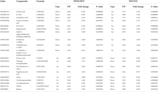 HFDS组与HFD组相比,共有9种代谢产物含量上调,HFD组与ND组相比,这些代谢产物含量下调;HFDS组与HFD组相比,共有10种代谢产物含量下调,HFD组与ND组相比,这些代谢产物含量上调(表2)。
