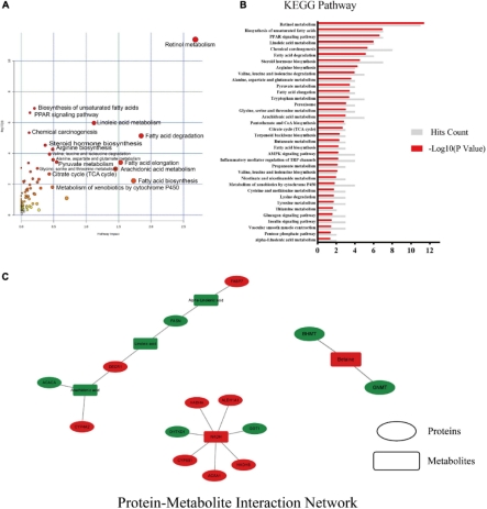 52种不同蛋白质和19种不同代谢物的数据上传至metaboanalyst 5.0,以分析MSS对高脂饮食喂养大鼠肝脏的干预效果及其机制(图5A、B)。使用Cytoscape绘制蛋白质-代谢物相互作用网络(图5C),结果表明,蛋白质和下游代谢产物主要富集于PPAR信号通路、视黄醇代谢、脂肪酸β氧化、脂肪酸降解和脂肪酸生物合成、甘氨酸、丝氨酸和苏氨酸代谢、丙酮酸代谢、柠檬酸循环(TCA循环)等途径。