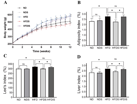 (A)12周内大鼠的体重。(B)大鼠脂肪指数。(C)大鼠Lee’s指数。(D)大鼠肝脏指数。ND:正常饮食+蒸馏水(12周);NDS:正常饮食+MSS(12周);HFD:高脂饮食+蒸馏水(12周);HFDS:高脂饮食+MSS(12周);HFDIS:高脂饮食+MSS(前6周),然后蒸馏水(后6周)。*p<0.05表示有显著差异,ns表示无显著差异(ND vs. NDS,HFD;HFD vs. HFDS,HFDIS;HFDS vs. HFDIS)。