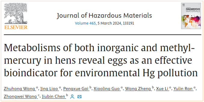 2023年12月14日,环境领域权威期刊《Journal of Hazardous Materials》(中科院1区TOP期刊,2023年最新IF=13.6)在线发表了公司王柱红副教授团队完成的研究论文 “Metabolisms of both inorganic and methyl-mercury in hens reveal eggs as an effective bioindicator for environmental Hg pollution”。该研究分析了禽类汞代谢的特征及相关机理。