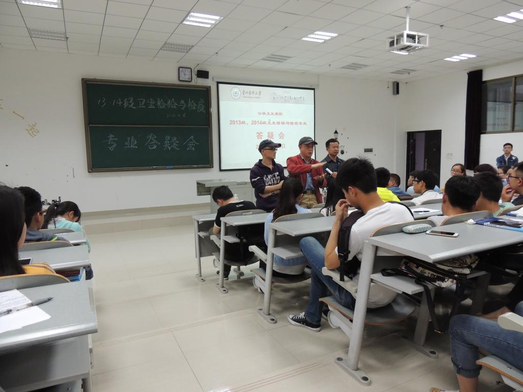 ,永利3044集团官网在花溪校区4404教室召开2013级、2014级卫生检验与检疫专业主题班会。永利3044集团官网常务副经理洪峰、教学科研管理科科长何江、卫生检验与检疫教研室主任胡勇、员工管理科科长刘亮出席班会,为同学们答疑解惑。