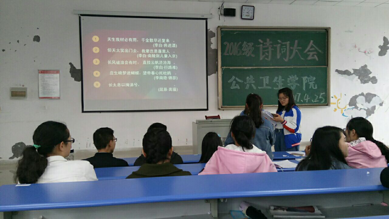 会上气氛十分活跃,参赛选手使出浑身解数,赢得全场同学的阵阵掌声。在优美的诗词行间,同学们徜徉于文学之海,感受古人如瀚海一般的情怀,感受文字里的推敲之美。 最终,王文静(2016级预防医学)获得一等奖;耿毅然 ,唐亚峰( 2016级卫生检验与检疫 )获得二等奖;曹小涛(2016级预防医学),刘回 、汪淑颖( 2016级卫生检验与检疫 )获得三等奖。比赛结束后,主持人请现场观众参与诗词接龙,同学们踊跃参与,现场气氛活跃。