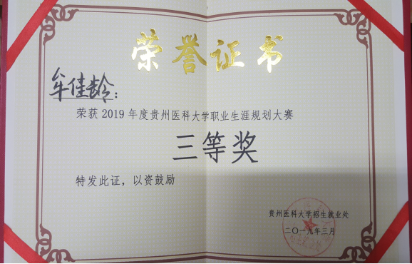 3月27日,在2019年度3044永利集团集团职业生涯规划大赛中,公司2015级预防医学专业牟佳龄同学荣获三等奖!