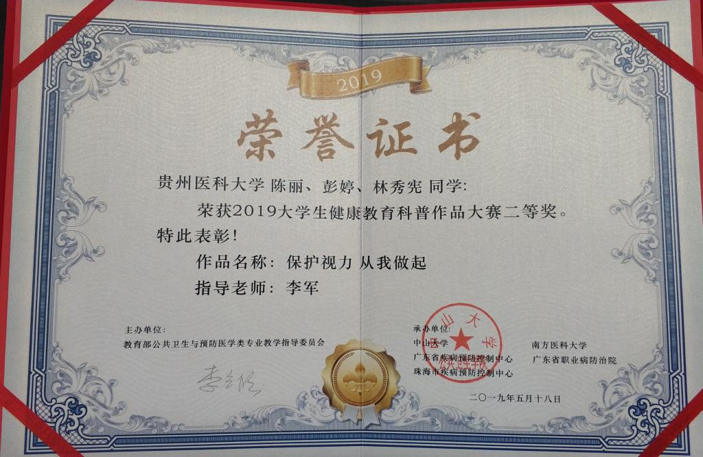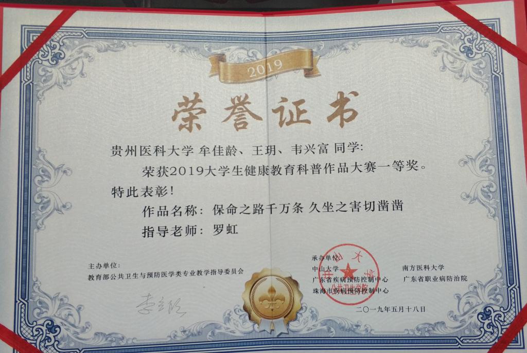 近日,由教育部公共卫生与预防医学类专业教育指导委员会主办,教育部公共卫生与预防医学类专业教学指导委员会主办,中山大学、南方医科大学、广东省疾病预防控制中心和广东省职业病防治院承办了“2019老员工健康教育科普作品大赛”评选结果揭晓,永利3044集团官网选送的2件员工创作作品在大赛中取得佳绩。由罗虹老师指导,牟佳龄、王玥、韦兴富同学创作的作品《保命之路千万条久坐之害切凿凿》获一等奖;李军老师指导,陈丽、彭婷、林秀宪同学创作的作品《保护视力从我做起》获二等奖。