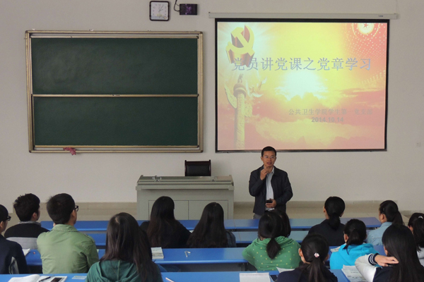 2012级预防医学专业员工符雄霞同学讲了党员的基本权利以及党的基本制度,2013级卫生检验与检疫专业李润琴同学讲党的组织形式,2012级卫生检验的丁家艳同学阐述了在党的十八大上党章的修改部分。最后刘亮针对以上同学的内容作了详细的总结并给各位党员提出了要求。