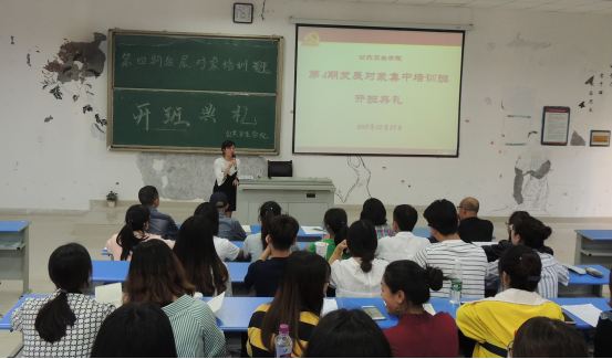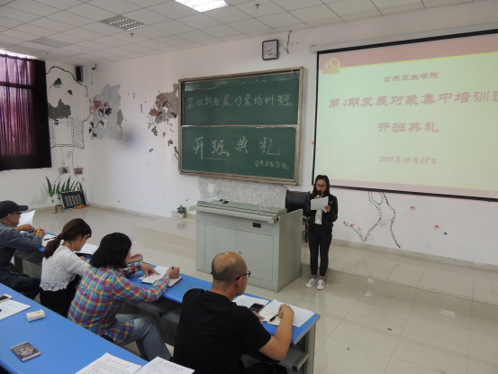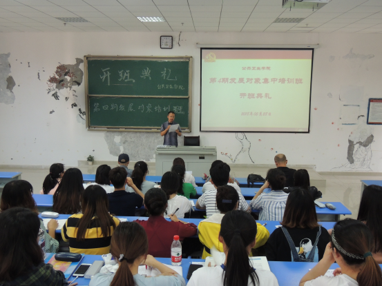 开班典礼在嘹亮的国歌声中拉开序幕。刘亮向全体学员介绍了本期发展对象培训班的教学安排、学习、纪律、考核要求及社会实践有关事宜;2016级预防医学专业张爱霞同学代表培训班学员发言,表达了作为培训班学员参加本次集中学习的激动心情,将会与全体学员以最饱满的热情和最实际的行动完成学习任务,在思想上和行动上积极向党组织靠拢,争取早日加入党组织。