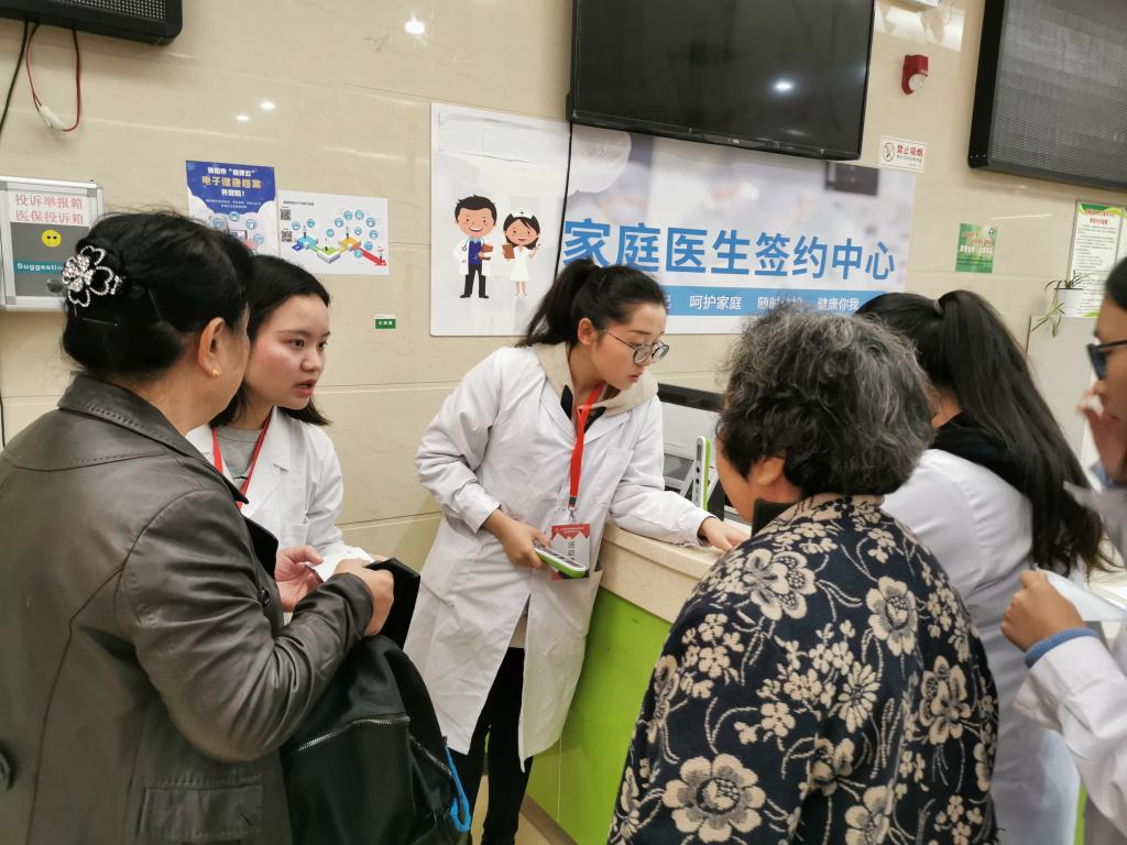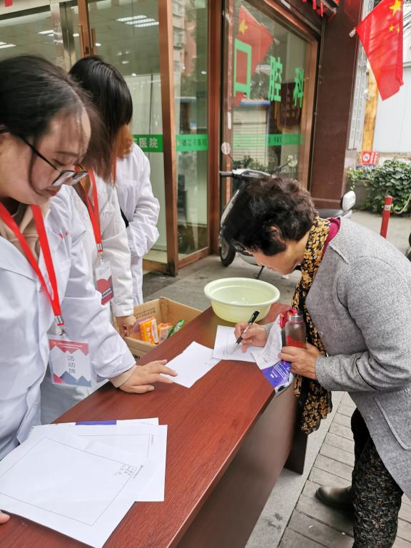 在金狮社区卫生服务中心门前,按照分工和各个岗位的具体要求,由引导组成员引导居民依次进行健康咨询、测量血压、身高、体重等工作,并发放慢性非传染性相关疾病的健康宣传资料;同学们耐心细致地为居民进行健康咨询,并根据居民个人不同健康状况,给予有针对性的、科学的指导。此外,同学们还充分发挥专业特长和优势,广泛开展高血压、糖尿病等慢性疾病防治的健康宣传、基本公共卫生知识普及活动。测量流程结束后由礼品发放组成员向参加本次活动的居民免费发放洗衣粉、洗衣皂和盆等生活常用品。