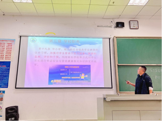 教工一支部雷时成、原琦、李博岩、孙大利老师围绕餐饮服务场地布局、人员要求、保洁卫生要求、食品污染的分类和危害,结合食堂在运行过程中常见的食品安全风险点,强调食品安全规范操作的重要性。